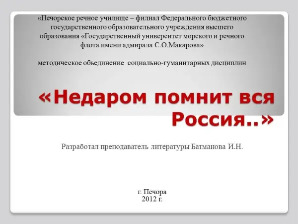 Конкурс «Недаром помнит вся Россия» расширяет знания студентов о романе Л.Н. Толстого «Война и мир», а также совершенствует их знания о Отечественной войне 1812 года с точки зрения истории и живописи. Это мероприятие завершает изучение творчества Л.Н. Толстого.