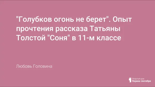 В статье дан многоаспектный анализ рассказа Татьяны Толстой "Соня" (сб. "Река Оккервиль"). Основное внимание уделяется поэтике Толстой. Чтение этого рассказа на завершающем этапе изучения литературы в 11-м классе оправдало себя. Рассказ ставит важные нравственные вопросы, возвращает ученика к лучшим традициям русской классики. Рассказ позволяет говорить о постмодернизме как о современном художественном направлении. В статье указаны вопросы и задания для учеников.