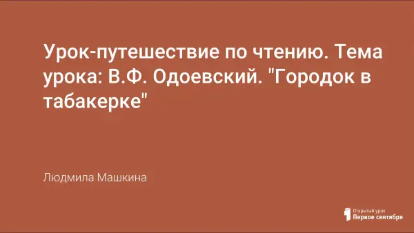 Новое время ставит перед учителем новые задачи. Он обязан сохранить ребенку детство и научить его учиться. Одним из аспектов этого умения является чтение. Оно как никакой другой предмет развивает психологическую, физическую и социальную деятельность человека. Дает возможность учителю понять, каким пришел ребенок в школу, как он реагирует на те или иные события, что его волнует. Урок чтения — это прежде всего общение, что чрезвычайно важно сегодня для развития личности, снятия ее агрессивности. Чтение — один из основных способов приобретения информации, поэтому овладение навыком полноценного чтения является для учащихся важнейшим условием успешного обучения в школе по всем предметам. Сказка В.Одоевского "Городок в табакерке" очень актуальна для современного образования. Побуждает ребенка к исследованию механизмов, заставляет заглянуть в сказочный мир техники.