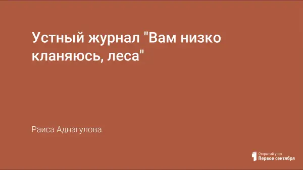Устный журнал "Вам низко кланяюсь, леса" — это только часть работы над темой "Лес". Первая страница "Научная" рассказывает о лесе как биогеоценозе, вторая — знакомит нас с поэзией Фета и Пушкина, которая проникнута любовью к лесу. Третья страница "Кладовая здоровья" знакомит с практическим применением некоторых растений леса в лекарственных целях.