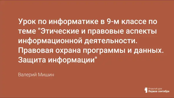 Основной темой данного урока являются вопросы, связанные с этическими и правовыми аспектами информационной деятельности, правовой охраной программ и данных, а также информационной безопасности.