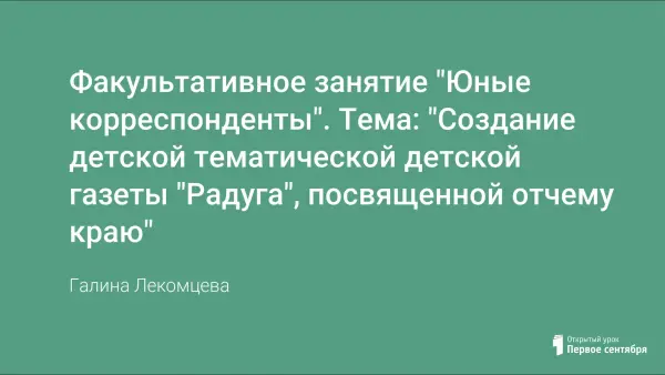 Основная задача факультативных занятий "Юный корреспондент" по созданию детской тематической газеты "Радуга" (тема "Отчий край") — воспитание патриотизма, любви к своей малой родине — Удмуртии, развитие творческого потенциала обучающихся. На занятии звучат стихи собственного сочинения, эссе. Результат — анонсирование газеты, создание буклетов и слайдовой презентации.