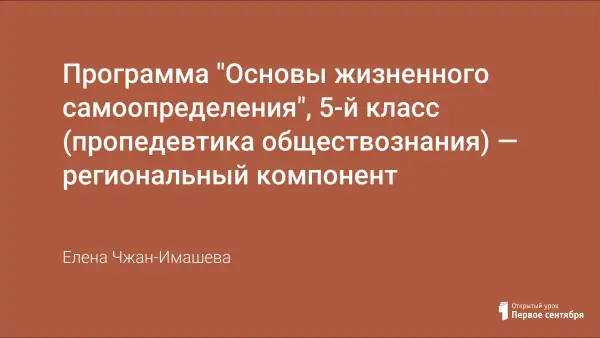 Программа курса «Основы жизненного самоопределения» для 5-го класса. В основу программы легли некоторые обществоведческие курсы, существующие в образовательной среде. Цель курса — формирование социальной компетентности. Данный курс можно использовать не только в рамках изучения предмета, но и во внеклассной работе.