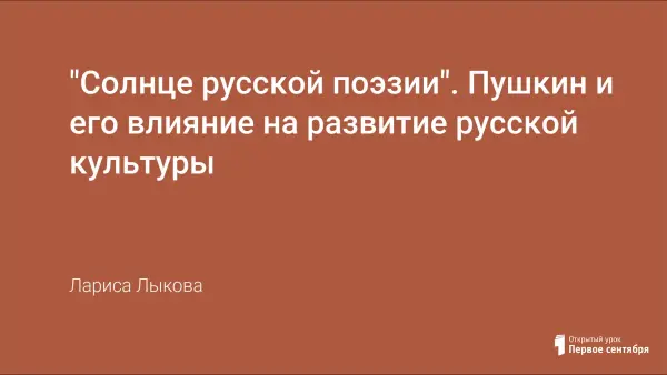 Представлена статья "Солнце русской поэзии". Пушкин и его влияние на развитие русской культуры. Материалы данного урока можно использовать на заключительном уроке по творчеству Пушкина в 9-м классе, при изучении темы "Русская культура XIX века" по МХК, во внеклассной работе по литературе.