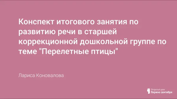 Представленное занятие являлось итоговым в цикле тем "Весна. Перелетные птицы". По типу и структуре занятие являлось обобщающим. Проводилось с подгруппой детей 5-6 лет, имеющих речевое заключение ОНР III уровня и недостатки интеллектуального развития по типу ЗПР. С учетом этого в занятии были подобраны игры и упражнения, направленные на развитие всех компонентов речи.