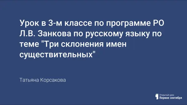 Урок разработан по системе РО Л.В. Занкова по учебнику А.В. Поляковой, 3-й класс. Дает представление о первичном знакомстве с тремя склонениями имен существительных в форме дидактической сказки.