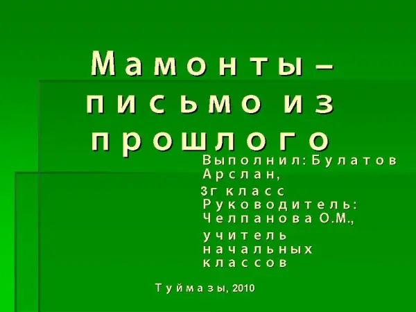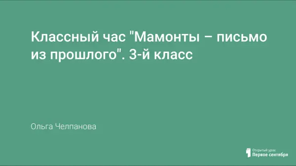 Классный час знакомит обучающихся с материалами исследовательской работы ученика. Цель урока – формирование первоначальных знаний о мамонтах; пробуждение познавательного интереса к истории родного края, археологии.
