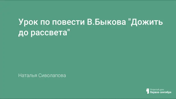 Урок по повести В.Быкова «Дожить до рассвета» может быть проведен накануне Дня Победы в 7‒8-х классах по любой из действующих программ. Цель: воспитание у учащихся чувства гордости за тех безымянных героев, павших в безвестных боях, честно выполнивших свой долг перед родиной.