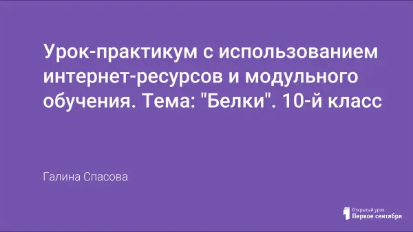 Урок проводится как урок изучения нового материала. Представлен модулем для учащихся и бланком ответов. Общая цель урока: дать определение белкам, изучить структуру и классификацию белков и их свойства, определить наличие белков в продуктах питания, сделать вывод о том, для чего необходимо разнообразить свой пищевой рацион.