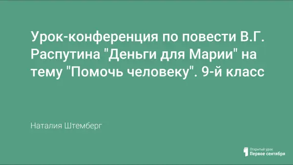 Урок-конференция по литературе на тему «Помочь человеку» для учащихся 9-х классов продолжает знакомство с творчеством писателя В.Г. Распутина и преследует цель: довести до современного читателя мысль о необходимости воспитания в себе нравственных качеств, без которых человеческое общество невозможно.