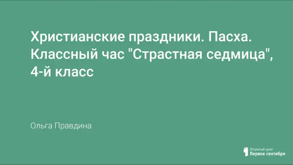 Классный час для 4-го класса «Страстная седмица» знакомит учащихся с русскими народными праздниками, обычаями, традициями русского народа, связанными с христианством, приобщает учащихся к нравственным основам Православия, воспитывает чувство гордости за русскую землю.