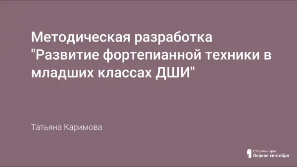 Целью данной работы является изучение и дальнейшая разработка методических приёмов развития фортепианной техники и упражнений для обучающихся младших классов детской школы искусств, повышение интереса обучающихся к этому виду работы, а также стремление облегчить процесс овладения пианистическими навыками.