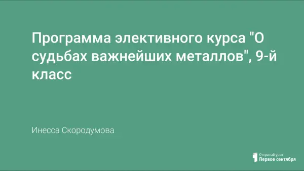 Цель: создать условия для развития познавательного интереса к химии, как одной из наук о природе, в частности, на материале элективного курса: "О судьбах важнейших металлов"; осознанного выбора профиля в средней школе.