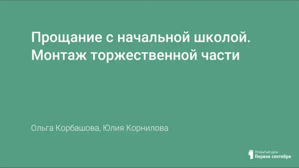 Цель праздника: подведение итогов периода обучения учащихся в начальной школе. Монтаж торжественной части Прощания с начальной школой предназначен для двух классов. Праздник рекомендуется проводить в актовом зале. В начале праздника все дети выстроены на сцене. В стихотворном монтаже участвует каждый ученик. В сценарии использованы стихи известных авторов. Тексты песен переделаны Корбашовой О.В., Корбашовым В.Е., Корниловой Ю.В.
