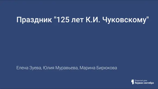 Внеклассное мероприятие, посвященное 125-летию со дня рождения К.И. Чуковского. Праздник для учащихся начальных классов. Цели: познакомить с творчеством писателя, расширить читательский кругозор, развивать творческие способности. В мероприятии принимают участие ученики начальных классов. Сценарий праздника содержит краткие сведения о творчестве писателя, инсценировку и театрализацию сказок "Федорино горе", "Муха-Цокотуха", выразительное чтение стихотворений.