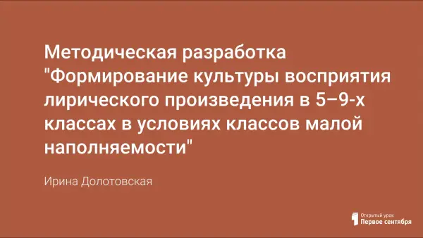 Цель методической разработки – на основе анализа научной и методической литературы и многолетней практики обосновать и разработать методику формирования культуры восприятия лирического произведения в 5–9-х классах малокомплектной школы, учитывающую особенности поэтического языка, способствующую углублению восприятия лирического произведения и развивающую эмоциональную сферу учащихся 5–9-х классов в процессе изучения лирики.