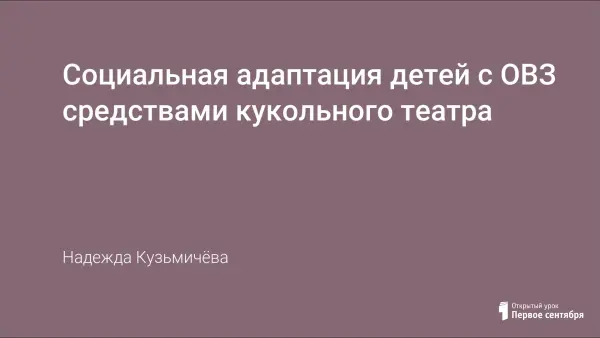В работе описывается опыт работы с детьми ОВЗ средствами кукольного театра. Также предложены формы работы по социальной адаптации детей-инвалидов в кукольном театре «Арлекин». Данная форма работы дает воспитанникам с ОВЗ возможность жить в коллективе и общаться со своими сверстниками. Формирует умение ориентироваться в этой жизни, способствуя их социализации, развитию и самоутверждению.