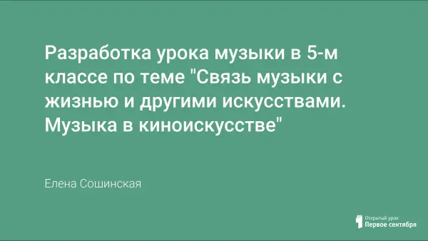 Разработка урока музыки в 5-м классе направлена на закрепление понимания взаимосвязи музыки с литературой. В содержании урока раскрывается роль музыки в киноискусстве. На уроке используются информационные технологии в форме презентации (тексты исполняемых песен, вопросы и задания для учащихся).