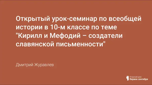 Важнейшей функцией изучения истории является формирование гражданственности, патриотизма, личной ориентации молодого человека. Цель урока – охарактеризовать просветительскую деятельность славянских святых Кирилла (Константина) и Мефодия, влияние славянской письменности на культуру славянских народов Центральной, Южной и Восточной Европы. Современные историки и культурологи говорят о существовании определенной кирилло-мефодиевской традиции в культурном единстве славянского мира. Именно сейчас славянские народы, особенно Россия, нуждаются в том, чтобы эта традиция сохранялась и развивалась. Знание о том, как это происходило, поможет осмыслить и многие современные процессы, происходящие в нашем обществе.