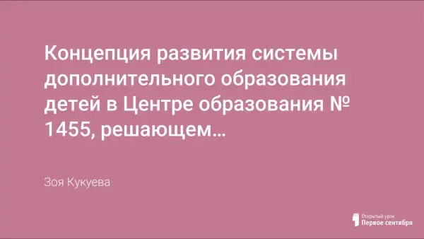 Концепция развития системы дополнительного образования детей в Центре образования № 1455, решающем проблемы интеграции основного и дополнительного образования детей и подростков, разработана директором Центра образования № 1455 Кукуевой Зоей Александровной. В ней рассматриваются цели, задачи, пути реализации соединения основного и дополнительного образования в единый образовательный комплекс и прогнозируемые результаты.