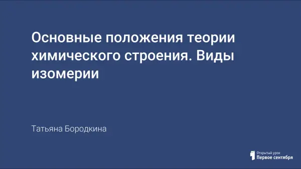 Данный урок является вторым уроком по теме и раскрывает сущность второго положения теории химического строения – явление изомерии. Урок проводится в профильном 11-м классе. На уроке учащимся предлагается вспомнить различные виды изомерии не только на примерах из органической химии, но и на примерах неорганических веществ.