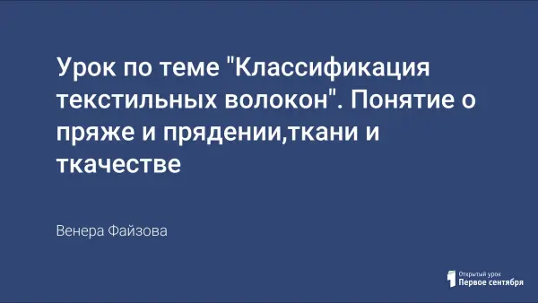 Урок по теме «Классификация текстильных волокон. Понятие о пряже и прядении, ткани и ткачестве» знакомит учащихся 5-го класса с элементами материаловедения. Учащиеся изучают натуральные волокна растительного производства, знакомятся с историей и профессиями прядильного и ткацкого производства.