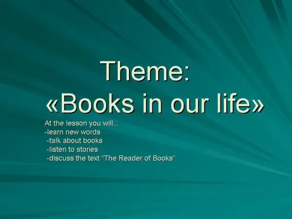 Урок позволяет создать положительную мотивацию к изучению английского языка и привить интерес к чтению книг. Цель урока: создать условия для осуществления образовательной деятельности в рамках общей темы. Урок дает представление, как можно расширить материал учебника за счет дополнительных упражнений и презентации к уроку.