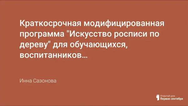 Краткосрочная модифицированная программа предназначена для преподавания декоративно-прикладного искусства в специальных коррекционных школах VIII вида воспитанникам 5–9-х классов. При составлении программы учитывались наиболее ценные традиции русской художественной росписи по дереву.