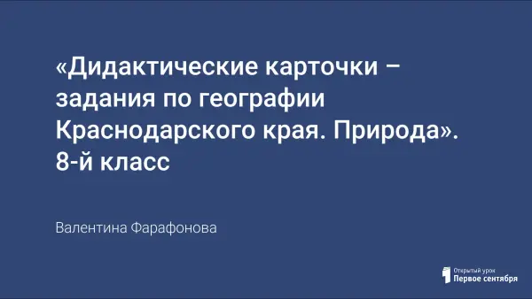 Содержание дидактических карточек-заданий по географии Краснодарского края повышает интерес учащихся к географии своей малой родины, активизирует познавательную деятельность, совершенствует навыки самостоятельной работы. Дидактические карточки-задания по географии Краснодарского предназначены для использования как непосредственно на уроках географии, так и в качестве материалов для домашних заданий, внеклассных мероприятий.