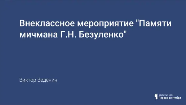 Внеклассное мероприятие "Памяти мичмана Г.Н. Безуленко, выпускника школы" посвящено началу 1990-х годов. В СССР начался процесс распада государства, обострились межнациональные отношения. Передел власти, передел собственности - это причины, следствие - появление вооруженных националистических группировок, их стремление дестабилизировать обстановку в стране. Вооруженные Силы вынуждены выполнять миротворческие функции, создавать разделительный щит между противоборствующими сторонами...
