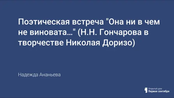 Представленный материал – литературная гостиная «Она ни в чем не виновата», посвященная Наталье Николаевне Гончаровой. Потребность восстановить справедливость в отношении кого-то оклеветанного, оболганного, непонятого в литературе – вот главный долг, который и заставил автора взяться за перо, работать в архивах. Долг же учителя литературы – познакомить современного школьника с творчеством замечательного поэта и его отношением к Пушкиным.
