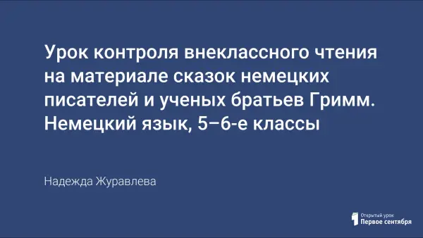 Урок контроля внеклассного чтения по немецкому языку в 5–6-м классах на материале сказок немецких писателей и ученых братьев Гримм. Одной из форм управления самостоятельным чтением учащихся на иностранном языке является читательская конференция. Данная конференция представляет собой устный журнал, основная цель которого – способствовать развитию устойчивого интереса у учащихся к чтению литературы на иностранном языке.
