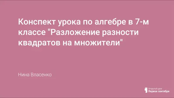 Конспект комбинированного урока «Разложение разности квадратов на множители». Это второй урок в данной теме. На данном уроке учащиеся, работая в разноуровневых группах, отрабатывают умения и навыки применения формулы сокращенного умножения.