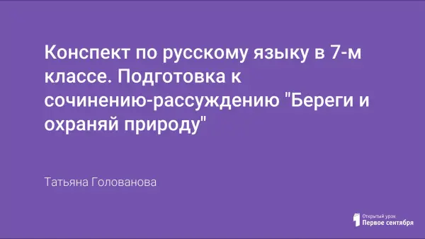 Урок посвящён подготовке к сочинению-рассуждению на публицистическую тему “Береги и охраняй природу”. Основные цели урока — обучение учащихся отбору и систематизации материала, построению высказывания на основе него, установлению логической последовательности частей текста и выбору языковых средств для их связи.