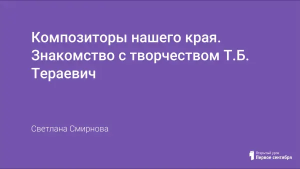 Цикл занятий для детей подготовительной к школе группы в рамках «Встречи в музыкальной гостиной». Занятия посвящены творчеству вологодского композитора-современника Т.Б.Тераевич. Цель подобных занятий – расширение кругозора ребенка-дошкольника путем встреч с интересными людьми, возможность знакомства с ними, воспитание чувства патриотизма и любви к своей малой родине.