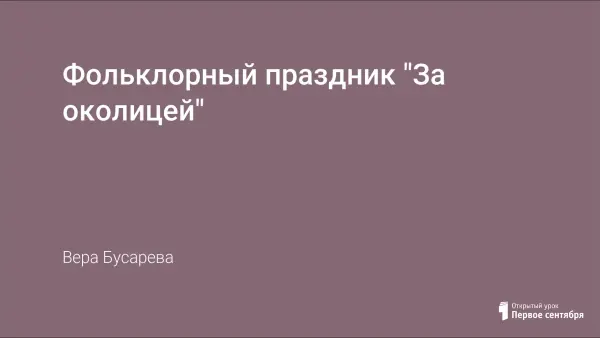 Фольклорный праздник "За околицей" является итогом и обобщением знаний, полученных учащимися в 4-м классе на уроках музыки (раздел "Музыка моего народа") и во внеклассной работе. Праздник проводился в форме соревнования. Учащиеся познакомились с традициями русской деревни и фольклором.