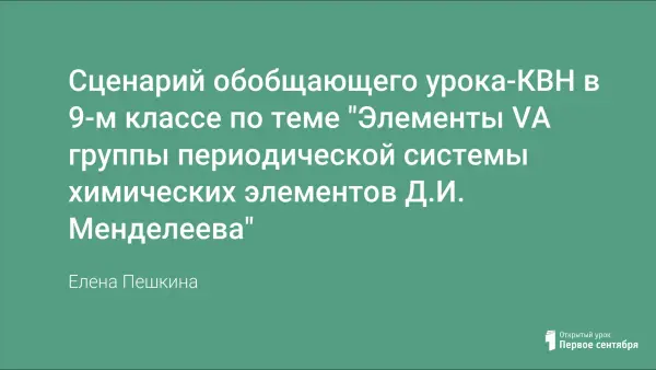 Обобщающий урок, построенный в форме КВН. Цель: обобщить знания о свойствах элементов VА группы, их роли в природе и жизни человека; подготовить обучающихся к проведению контрольной работы по данной теме. Проводятся: конкурс стенгазет, исторический конкурс, конкурс капитанов, конкурс “Бабушкина лаборатория”, химическое домино, экологический лабиринт.