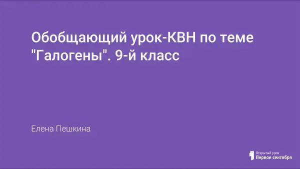На уроке в увлекательной форме – в виде игры-соревнования «КВН» обобщаются и корректируются знания по теме «Галогены». Учащиеся выполняют разнообразные задания: отгадывают кроссворд и решают задачу практической направленности, находят и исправляют ошибки в рисунках приборов, участвуют в химической эстафете, отвечают на вопросы викторины «Своя игра», проходят «Экологический лабиринт». В презентацию включена музыка и видефильмы с опытами.