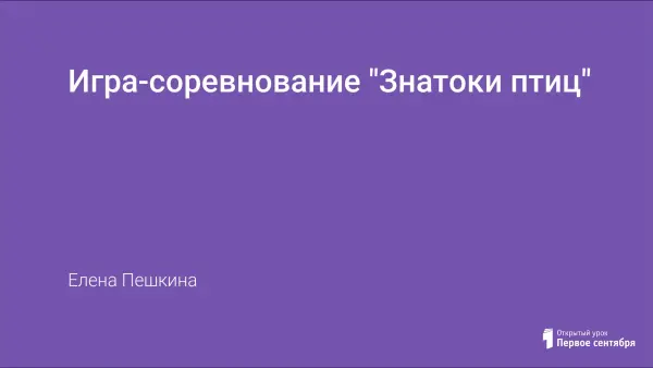 Игру-соревнование можно проводить как обобщающий урок в 7-м классе по теме «Птицы». В качестве домашнего задания учащиеся подбирают пословицы и поговорки про птиц, придумывают фантастических птиц, разучивают стихотворения о значении птиц в природе, о необходимости бережного отношения к ним. В ходе игры и участники команд, и зрители отвечают на вопросы викторины, отгадывают загадки, знакомятся с птицами России, слушают их голоса.