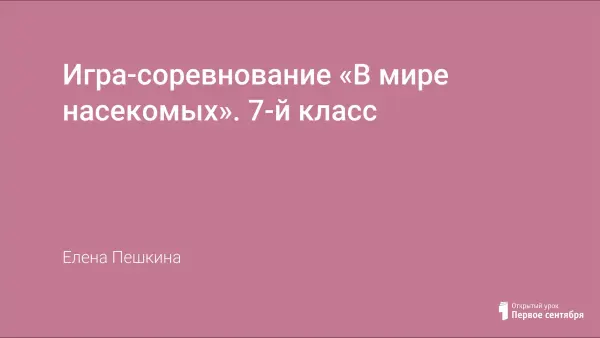 Игра-соревнование «В мире насекомых» может проводиться или как обобщающий урок биологии в 7-м классе, или как внеклассное мероприятие. Представлен очень интересный и разнообразный материал. Ребята разгадывают кроссворд и ребусы, отвечают на вопросы блицконкурса и викторины «Занимательная энтомология», показывают свои знания о насекомых Красной книги, демонстрируют умения различать вредных и полезных насекомых. Мероприятие сопровождается презентацией.