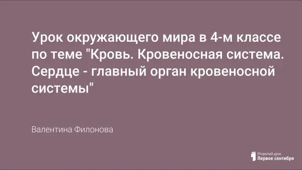 Урок окружающего мира в 4-м классе (УМК «Начальная школа XXI века») способствует расширению знаний обучающихся о крови и кровеносной системе, о ее значении в жизни человека, развивает интерес к познанию "самого себя" и воспитывает в детях заботливое отношение к своему здоровью