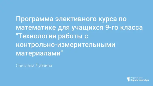 Учитывая новую форму проведения итоговой аттестации выпускников основной школы в формате ЕГЭ, предлагается программа элективного курса по алгебре для учащихся 9-го класса «Технология работы с контрольно-измерительными материалами». Основная задача – повторить, обобщить и расширить знания по темам курса математики с 5-го по 9-й класс.