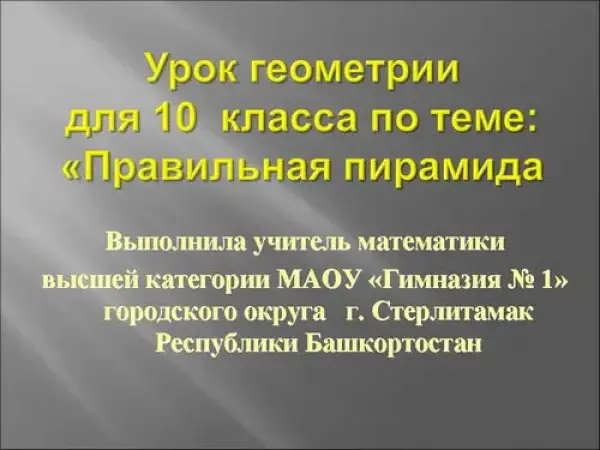 Подобраны задания, которые отражают практические навыки построения пирамид, умение отмечать углы между прямой и плоскостью, углы между плоскостями. Устные задачи обобщают знания и умения по теме "Пирамида". Неотъемлемая часть ‒ презентация в PowerPoint, повторяет изученный материал и наглядно демонстрирует новые понятия, экономит время для решения большего количества задач.
