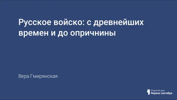 Представлен конспект урока по теме "Русское войско: с древнейших времён и до опричнины" в 7-м классе. Данный урок рассчитан на один академический час. Он должен помочь учащимся в осмыслении процессов, происходивших в русской армии, выявить роль войска в развитии государства, обобщить знания об особенностях вооружения, обмундирования и состава русского войска. Урок должен показать, как на протяжении различных периодов русской истории менялось оружие, появлялись новые рода войск и тактика боя.