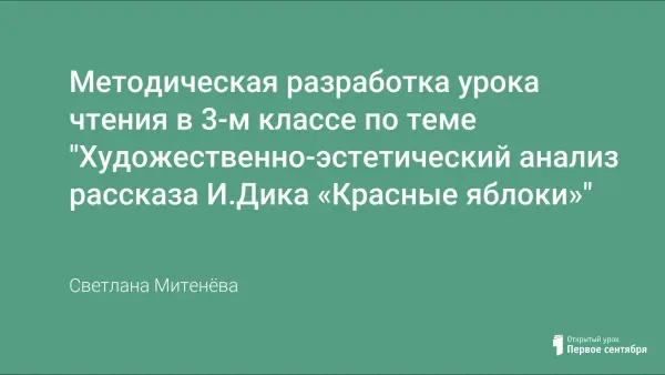Методическая разработка урока чтения в 3-м классе по теме «Художественно-эстетический анализ рассказа И.Дика «Красные яблоки». В результате художественно-эстетического анализа произведения осмысливают текст, оценивают себя как читателя. Постигая внутренний мир литературных героев, пытаются измениться сами. Пребывание в проблемном диалоге позволяет выработать у его участников способность слушать и слышать собеседника, высказывать определенную нравственную позицию.