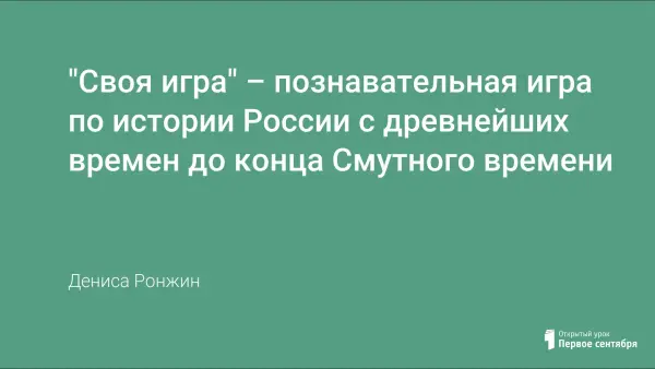 Данный урок представляет собой игровую форму проверки знаний учащихся по большому разделу истории России с древнейших времён до конца Смуты по типу "Своей игры". Цель урока: через диагностику уровня обученности