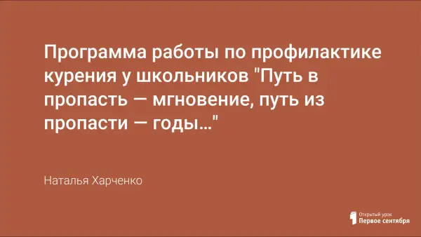 Программа формирует потребности быть здоровым через отказ от табакокурения (для учащихся 7‒11-х классов). В результате программы у школьников формируется у школьников представление о социальных и психологических последствиях курения, прививаются навыки здорового образа жизни.