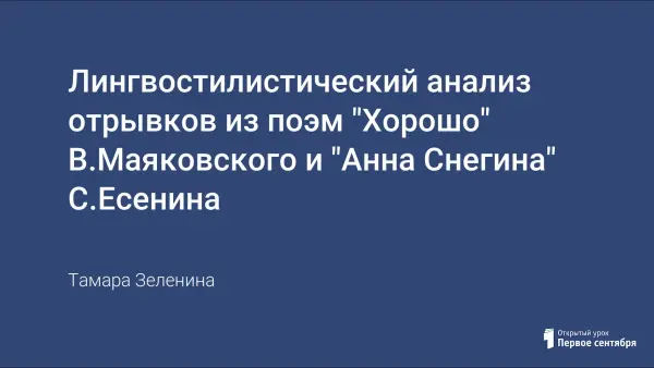 Проведя сопоставительный лингвостилистический анализ отрывков из поэм "Хорошо" В.Маяковского и "Анна Снегина" С.Есенина, обучающиеся на основе собственных наблюдений над текстами убеждаются в эстетической функции языка; выявляют определенные закономерности, характерные для стиля В.Маяковского и С.Есенина; приводят собственные аргументы для обоснования выдвинутого тезиса.