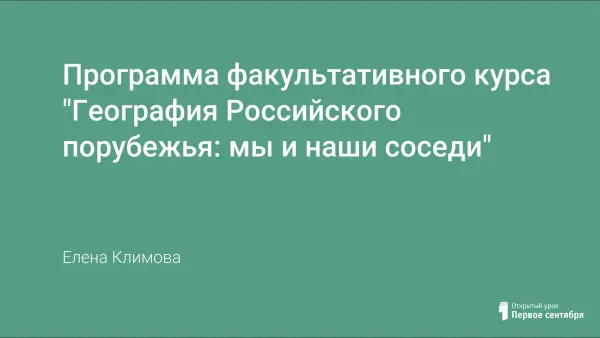 Программа факультатива рассчитана для учащихся 10–11-х классов. Она составлена на основе учебного пособия Бабурина В.Л., Даньшина А.И. и Елховской Л.И. "География Российского порубежья: мы и наши соседи". Программа курса призвана закрыть мировоззренческий пробел в образовании учащихся, формируя целостное представление о едином геополитическом пространстве России.