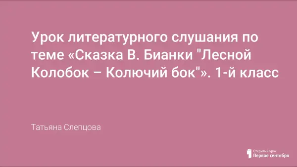 Урок литературного слушания знакомит детей с произведением В. Бианки «Лесной Колобок – Колючий бок». В ходе урока решаются задачи: учить правильно называть произведение и книгу, выразительному чтению в лицах, сравнивать героев и содержание сказок с «бродячим» сюжетом, видеть отличительные черты народной сказки от литературной; развивать речь и творческие способности через инсценирование сказки; запоминать наизусть отрывки (песенки) из сказки.
